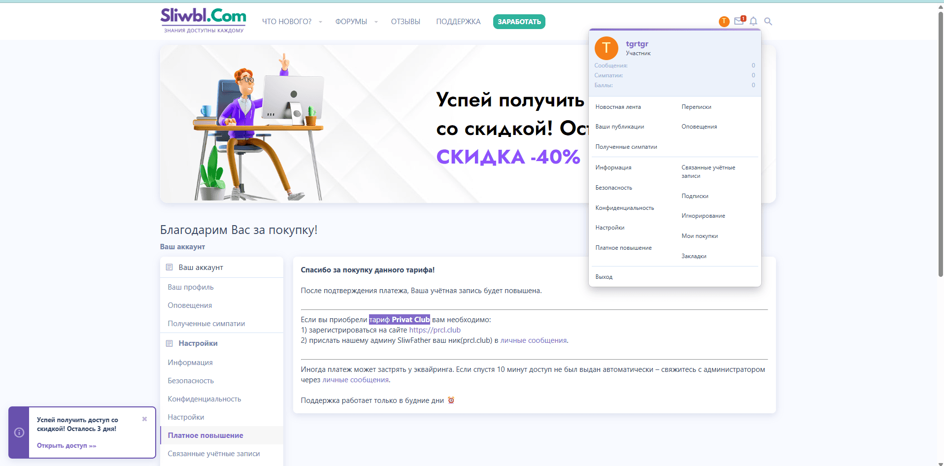 Добрый день, оплатила вчера доступ к форуму и приват клубу, пришло подтверждение , что все оплачено, но в приват клуб вы меня не добавили, пожалуйста, дайте мне доступ. tonia tonia